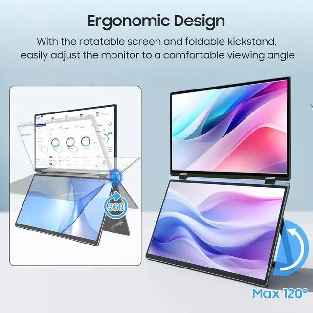Ergonomic Design Meets Flexible Viewing: Work or play in comfort with the 90 foldable kickstand, designed to support the perfect viewing angle. Need even more flexibility? The screen rotates a full 360, giving you total control over your setup, whether you're collaborating with others or multitasking like a pro. Especially valuable for users looking to save desk space or create a multi-monitor setup. With VESA support, you can easily mount the monitor to a wall, monitor arm, or any VESA-compatible mounting system ^^ Dual-Device Mastery with 4 Dynamic