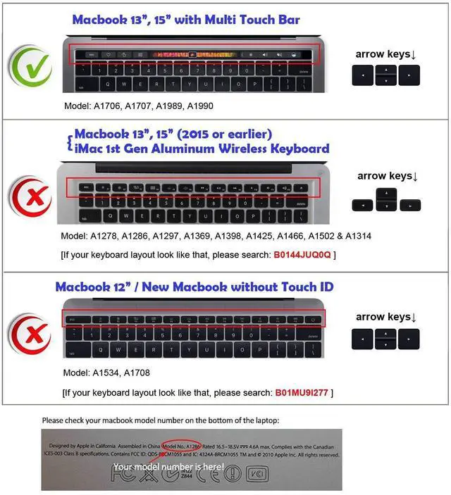 Model Guide for Macbook: Turn your laptop upside down, underneath, locate the Model Number in small print that start with "A****"Features: -Clean by placing in boiling water and or washing with soapy water-Strong and durable-Easy to apply-Fits every contour of your keyboard-Reduces the sound from typing-Unique thinness gives excellent fell-Upper side adopted rubber coating, gives you a comfortable soft touch feeling and ensure long lasting durability-Lower side is shiny surface, make the keyboard cover fit perfectly without any sticker/glue, will not slip or slideSpecial notes: -Color coding generally indicate for how the grouping of tools is on workspace-XSKN assure every product provided with excellent quality-To maximize its functional character, the cover is fully printed with instructive letters and icons, thus unable to support back-light-Camera's Focus Mode will make focused part pretty clear and unfocused part fuzzy, but real product will be nice and clearPackage