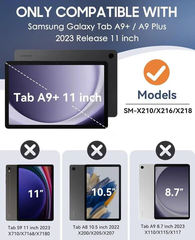 Perfect CompatibilityExclusively designed for Samsung Galaxy Tab A9+/A9 Plus Case 11 inch 2023 Release (SM X210/X216/X218). Please kindly check the model number on your samsung a9+ tablet.