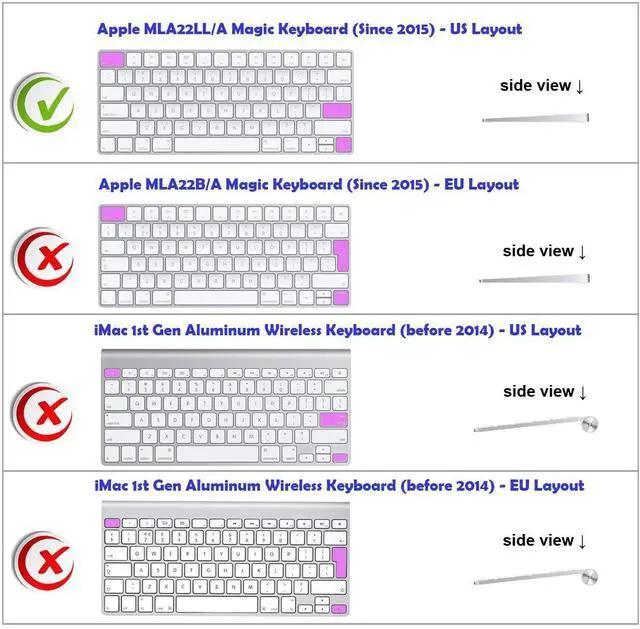 Features: -Clean by placing in boiling water or washing with soapy water-Strong and durable-Easy to apply-Fits every contour of your keyboard-Reduces the sound from typing-Unique thinness gives excellent feelCompatible device: -for Apple Magic Keyboard (2015 released, 6 lines of keys, lower right corner key is square instead of a slim wide bar)Know your keyboard version: EU version--- the "Enter/Return" key looks like numeral "7", please choose "US & EU version"US version--- the "Enter/Return" key is a horizontal wide bar, please choose "US version" (US&EU version works too)XSKN US&EU version fits both US version and EU version keyboard, product looks exactly same as photo display, it covered 2 nearby keys, which does not affect normal use, printing on it will show you where to pressSpecial notes: -XSKN assure every product provided with excellent quality-Affected by daylight, product color may look slightly different under camera-Camera's Focus Mode will make focused part preety clear and unfocused part fuzzy, but real product will be nice and clearPackage