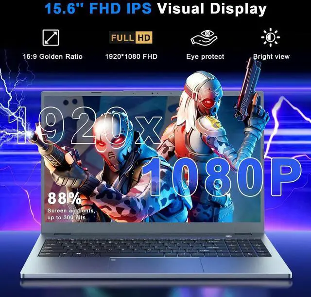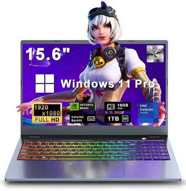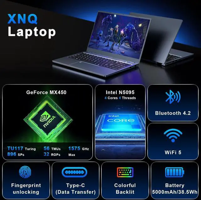 15.6" FHD Productivity Display with 16:9 Aspect RatioXNQ Gaming laptop has 15.6 -inch FHD (1920x1080) screen, featuring an anti-glare matte finish and 16:9 aspect ratio - perfect for office documents, creative work, and casual games. ^^ Dual Graphics Power with Intel UHD & MX450Equipped with Intel UHD & INVIDIA MX450, this device balances daily efficiency and light graphics needs; Plus an N-Series processor (4C/4T, 1.7 - 3.4GH z) for responsive tasks, and preinstalled Win11 Proideal for students and productivity users. ^^ 16GB DDR4 RAM + 1TB SSDThe XNQ laptop computer packs 16GB of high-speed DDR4 RAM (upgradable to 64GB), enabling snappier app launches and seamless multitasking.