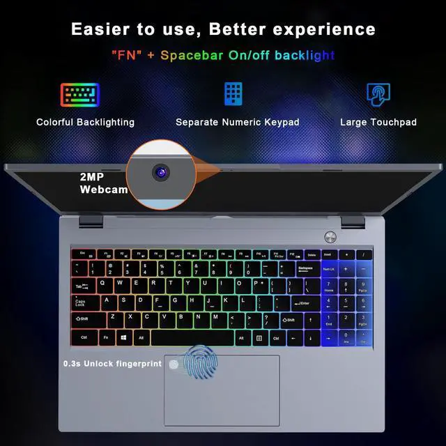 Plus, its 1TB SSDpaired with a bottom expansion slot that supports up to 2TB of additional storageoffers ample space for essential files, apps, and media, perfectly meeting your gaming and multimedia needs for reliable, consistent performance every time. ^^ Cool Backlit & Fingerprint UnlockType comfortably day or night with the vibrant colorful backlit keyboardits unified, eye-catching glow casts a sleek (dazzling) light over every key. Plus, the advanced fingerprint sensor adds a layer of security thats both smart and fast: it recognizes your print instantly to unlock the device in a flash, keeping your data safe without the hassle of typing passwords. ^^ Durable metal shell Laptop metal casings outshine plastic ones significantly. They offer sturdier build quality, resisting scratches and impacts better for longer durability. With superior heat dissipation, they keep the device cooler during use. Plus, their sleek, premium texture elevates the laptops overall look, blending style with practicality. ^^ Wifi and BluetoothSupports WIFI5 802.11 and Bluetooth 4.2, ensuring stable and fast wireless connection whether working from home or traveling, 38Wh battery and backlit English keyboard allow you to maintain efficient work efficiency from day to night. ^^ Quality Laptops, Exceptional SupportEvery laptop undergoes rigorous multi-process inspections to meet our highest standards. Our team is here 24/7 to assist, and we stand behind your purchase with 1 full year of free returns and exchanges service, ensuring smooth, reliable use under XNQ's care.