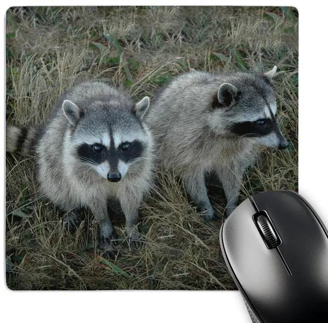 Two Raccoons Mouse Pad is 8" x 8" x. 25" and is made of heavy-duty recycled rubber. Matte finish image will not fade or peel. Machine washable using a mild detergent and air dry.