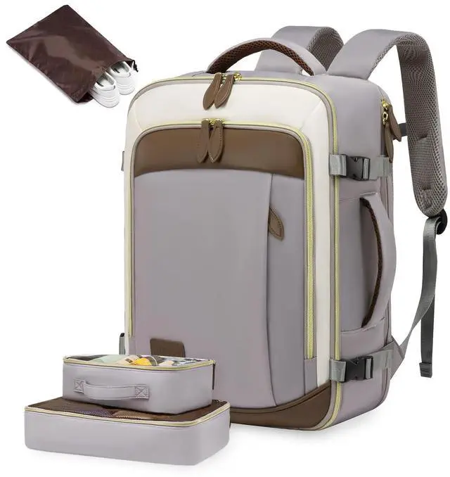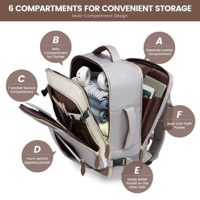EXPANSIVE 50L CAPACITY FOR ORGANIZED TRAVEL - Journey with everything your travel essentials for 4-7days, neatly organized in this versatile carry on backpack. Its luggage-style main compartment, separate laptop section, and multi-pocket zipper front pocket offer unmatched convenience ^^ LIGHTWEIGHT YET RUGGED - Crafted from tear-resistant, water-resistant materials, this travel backpack for women weighs a mere 2.6 pounds. Complemented by exquisite craftsmanship and reinforced stress points. This backpack withstands the rigors of travel ^^ AIR TRAVEL MADE EFFORTLESS - Glide through airports with ease! This carry on bag, sized at 19.5 x14x9 inches, aligns with most airline carry on travel bag requirements.