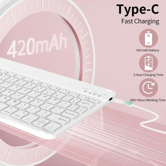 • Rechargeable and Long-Lasting BatteryOur ipad a16 case with keyboard features a built-in 420mAh high-capacity battery for enhanced energy efficiency, ensuring at least 200 hours of use. It fully charges in just 2 hours using the iPad A16 Keyboard Type-C charging cable, eliminating the need for battery replacement.
