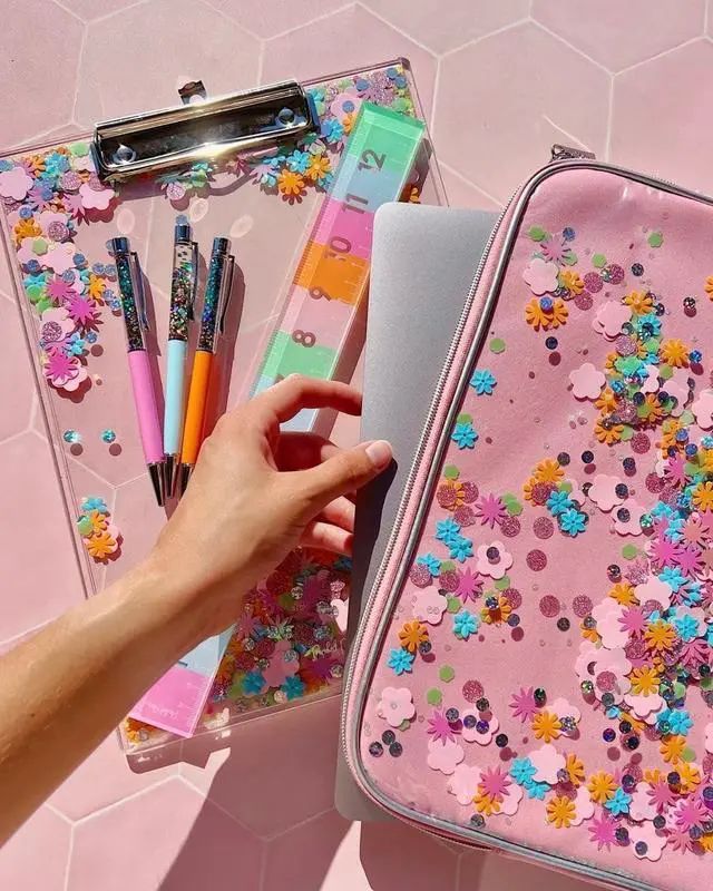 FASHIONABLE DESIGN. Elevate your desk with this fun and fashionable laptop case packed with colorful confetti. With a sleek shape and gold hardware details too, this functional and fashionable case is sure to make work and the mundane a little brighter.