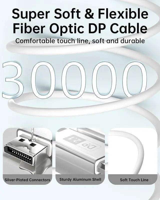 8K Fiber Optic DisplayPort Cable 2.1T his fiber optic display port 2.1 cable supports high resolution 16K@30Hz, 8K@60Hz, 4K@240Hz/120Hz/144Hz. DP 2.1 cable provides 40Gbps bandwidth, ensuring high-quality content transmission and lossless audio output, giving you the ultimate gaming and movie experience. ^^ Optimal Choice for Gaming EnthusiastsThis active displayport cable 2.1 Experience vivid, lifelike colors, enhanced contrast, and realism with Dynamic HDR support. Fibbr optical displayport cable 2.1 supports UHBR10, DSC 1.2 a, 3D, HDR, FEC, and FreeSync necessary for gaming G-Sync. You can easily connect multiple monitors using Multi-Stream Transport (MST).