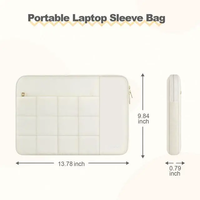 dimension: 13.78 x 0.79 x 9.84 inches (L x W x H); This padded laptop carrying case made with square quilted puffy polyester material, soft and good in touch. It's designed for 13-14 inch laptops.