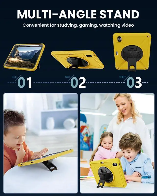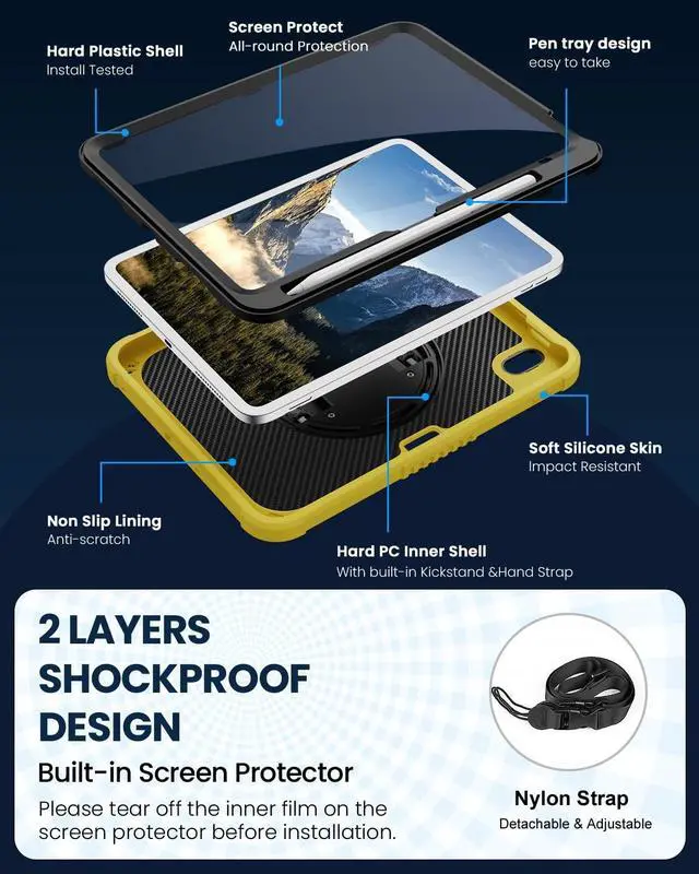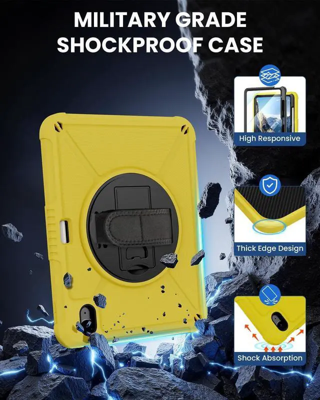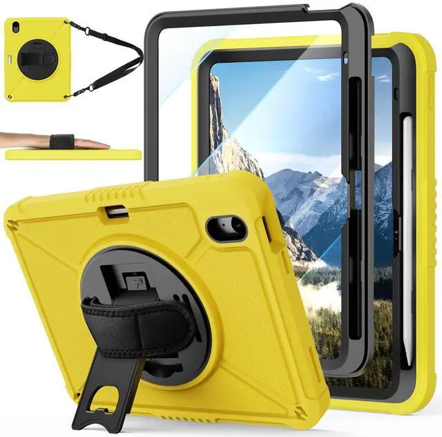 ^^ Convenient Pencil Holder: Our case has a built-in holder for your iPad Pencil which allows you to carry it easily with your device wherever you go. Please note that the iPad Pencil is NOT included. ^^ Rotating Stand + Hand Strap360 Rotating Kickstand provides multi-angle viewing, with soft handle strap, easier to hold and use your tablet in your outdoor travelling, working, gaming with kids. ^^ Portable Shoulder StrapThe adjustable shoulder strap provides the secureest protection and more convenience when you play or work with iPad A16/iPad 11th generation/iPad 10th generation. Hang it anywhere for your better entertainment, make your hands free. ^^ Multiple Protection + Heavy dutyHeavy Duty Case for Kids Playing and Studying, Hard PC front cover, PC back cover, TPU frame and Built-in screen protector provide the max full protection for your iPad A16/iPad 11th generation/iPad 10th generation and easy to install. Not only shockproof/durable but also comfortable hand feeling. ^^ Precise CutoutsPrecise cutouts allow easy access to all buttons(speakers, volume button, charging port, camera), ensuring that your iPad A16/iPad 11th generation/iPad 10th generation fits snugly in the case. ^^ Shockproof + Drop-proofEnhanced drop protection with extra shock absorption to provide outstanding protection for the ultimate drop defense.