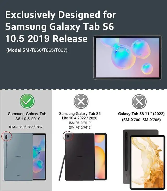 Compatible with: for Samsung Galaxy Tab S6 10.5" 2019 (Model SM-T860/T865/T867) release. Not compatible with Samsung Galaxy Tab S4 10.5" 2018 (T830/T837/T835) Not compatible with Samsung Galaxy Tab S6 Lite 10.4" 2020/2022 (SM-P610/P615/ P613/P619) Not compatible with Samsung Galax Tab A8 10.5 inch (2022) (SM-X200/X205/X207)Package