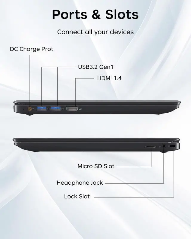 ^^ Lightweight & Ultra-Portable This 14 inch laptop is designed for life on the go, weighing only 2.9 lbs and measuring just 0.8" thin. Easily slip it into your bag for commuting, travel, or working from coffee shops. ^^ Reliable Wireless Performance Equipped with Wi-Fi 5 and Bluetooth 5.0, this slim laptop offers stable internet connectivity for video calls and seamless pairing with wireless devices like headphones or mice, supporting a productive mobile setup. ^^ Convenient Expansion Ports The inclusion of two USB 3.2 Gen 1 ports and a TF card reader offers great flexibility for a small laptop of this size.