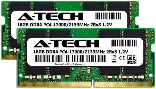 Compatible with select DDR4 Laptop, Notebook computers + Easy to install at home, no expertise required ^^ Maximize your system's performance, boost loading speeds and multitask with ease ^^ Backed by A-Tech's Lifetime Warranty + Friendly tech support team available to help before and after your purchase ^^ 32GB RAM Kit ( 2 x 16GB Modules ) ^^ DDR4 SO-DIMM 260-Pin ^^ Speeds up to 2133MHz, PC4-17000 / PC4-2133P ^^ NON-ECC Unbuffered ^^ 2Rx8 - Dual Rank ^^ JEDEC DDR4 standard 1.2V