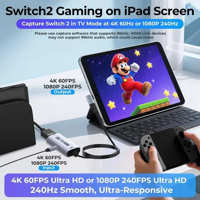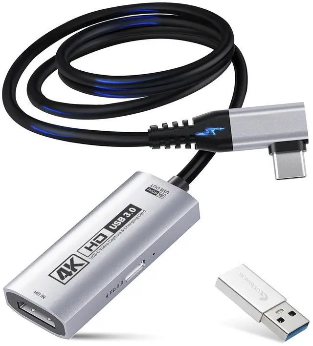 4K@60FPS Ultra-Clear Recording with High Refresh RateThis HDMI Video Capture Card records up to 4K@60FPS and supports 2K@144FPS input, delivering sharp details and vibrant colors for VR gameplay, fast-paced action, and tablet screen capture. Ideal for streamers and creators who require high-definition visuals. ^^ PD 100W Fast Charging While CapturingWith built-in PD 100W pass-through charging, this HDMI to USB-C capture card powers your tablet, laptop, or VR headset during long streaming or recording sessions, ensuring uninterrupted gameplay and content creation ^^ 90 Right-Angle Design for VR & Mobile ComfortThe ergonomic 90 right-angle USB-C connector with a 3.3 ft cable makes this 4K switch capture card perfect for VR headsets like Quest series and portable tablets, keeping cables out of the way for a more immersive experience ^^ Plug and Play for Streaming and RecordingNo drivers or external power requiredjust plug in and start.