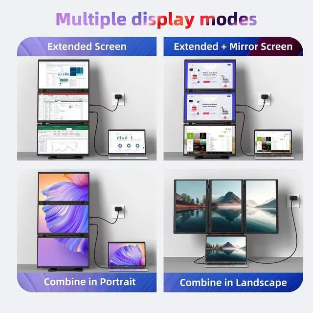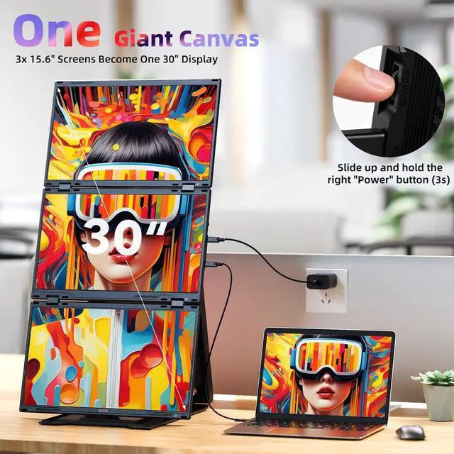 [Quad Screen Extender or 30-inch Combined Canvas] Expand your workspace with this quad laptop screen extender and instantly boost productivity. With one touch, combine 15.6 -inch triple monitors into a 30-inch canvasthe ultimate solution for wide code files, financial charts, and creative timelines. ^^ [Multiple Display Modes & Ultimate Flexibility] Choose from Extended, Mirror, and Combined Screen modes, with the added flexibility to independently power off the third screen. 360 rotation lets you effortlessly adjust from comfortable portrait coding to immersive landscape movie viewingmaximizing both efficiency and enjoyment. ^^ [Driver Required & Universal Compatibility] Enjoy a quick one-time driver installation for uninterrupted productivity, using the included dual-port USB flash drive (Type-C and USB-A).