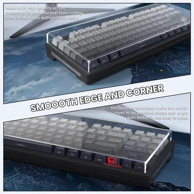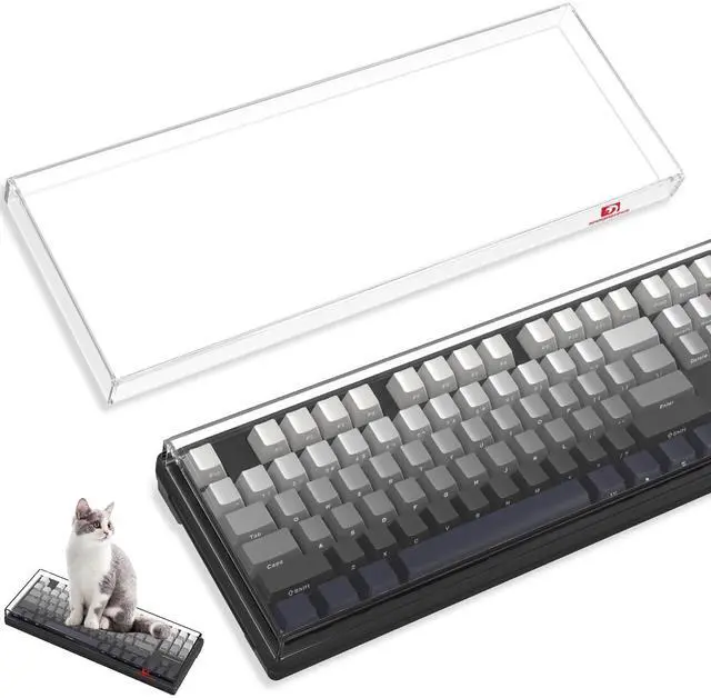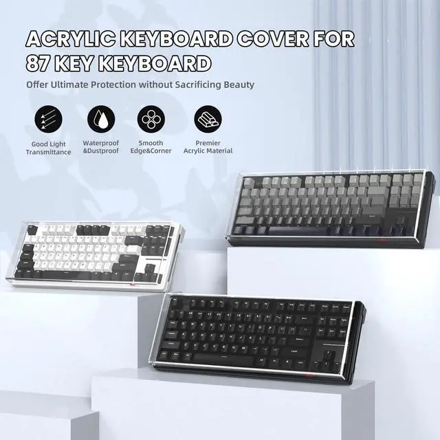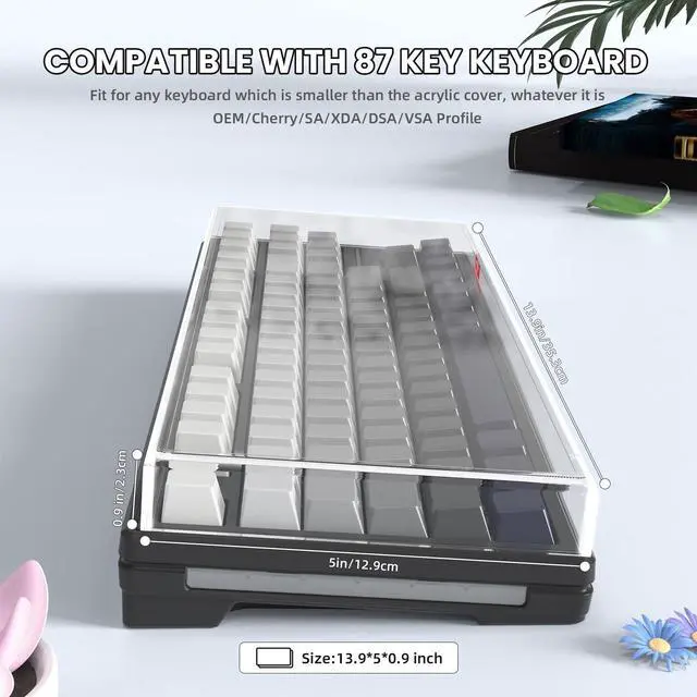 Durable, Practical&DecorativeThis translucent keyboard cover is made of premier sturdy acrylic material, can last long, easy to use, transparent feature can show your keyboard clearly after keeping it covered, simple but pretty and functional. ^^ Full ProtectionThis acrylic keyboard cover is like a rectangular case without lid, can effectively prevent dust and water and pet stomp damaging your keyboard when not using, also help you keep your keyboard clean, lengthen your keyboards service life. ^^ Fit for 75% KeyboardThis clear keyboard cover is designed for protecting standard 87/84/82 key or mini layout keyboard (mechanical or membrane or other type) which is at least 1 inch smaller than size L 13.9 *W5*H 0.9 In, easy to use and clean.