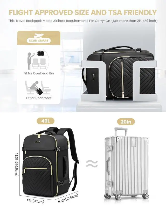 AIRLINE APPROVED & TSA FRIENDLY - 18.3 *13* 8.5 inch, 2.49 lb, the carry on backpack meets most international carry-on requirements, such as Spirit, Frontier, Jet Blue, Easy Jet, and other budget-friendly airlines. Fits under the seat or in the overhead bin, making it the perfect personal item travel bag for air travel. At checkpoint, unfolds the laptop compartment freely 90-180 degrees making you quickly through the airport security and keep other items tidy. ^^ LARGE CAPACITY & WELL ORGANIZED - This travel backpack has 40L capacity, 4 main compartments, and 19 pockets, designed to allow you to separate and organize your travel personal items easily, roomy space can even fit in 3-6 days of travel essentials.