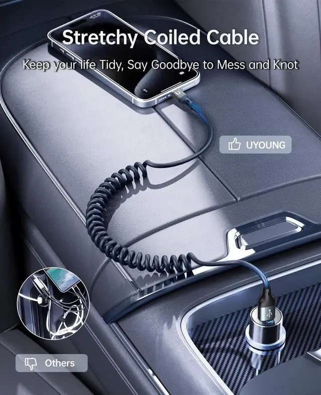 USB C Cable for Car This coiled USB A to USB C fast charging cable is portable and easy to use. It can save a lot of space in the car and bid farewell to the troubles of chaotic and tangled charging cables. ^^ iPhone 17/16/15 USB A to USB C Cables The coiled usbc charger cable natural length is 1.5 feet, stretchable to 4-5 feet (comfortable length), up to 6 feet. As a shorter expanded cord, its compact ability is more organized than a single straight cord. ^^ 66W USB C Cable Fast Charging and Data Sync E-Mark chip for safer charging.