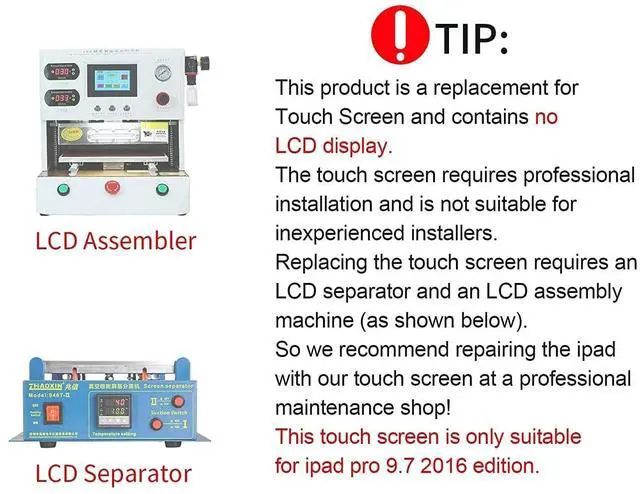 Compatible: Only for ipad pro 9.7 A1673 A1674 A1675. Please be sure to correctly identify your model before purchase. The wrong model could damage your pad. (Home button and LCD Not Include) 2.