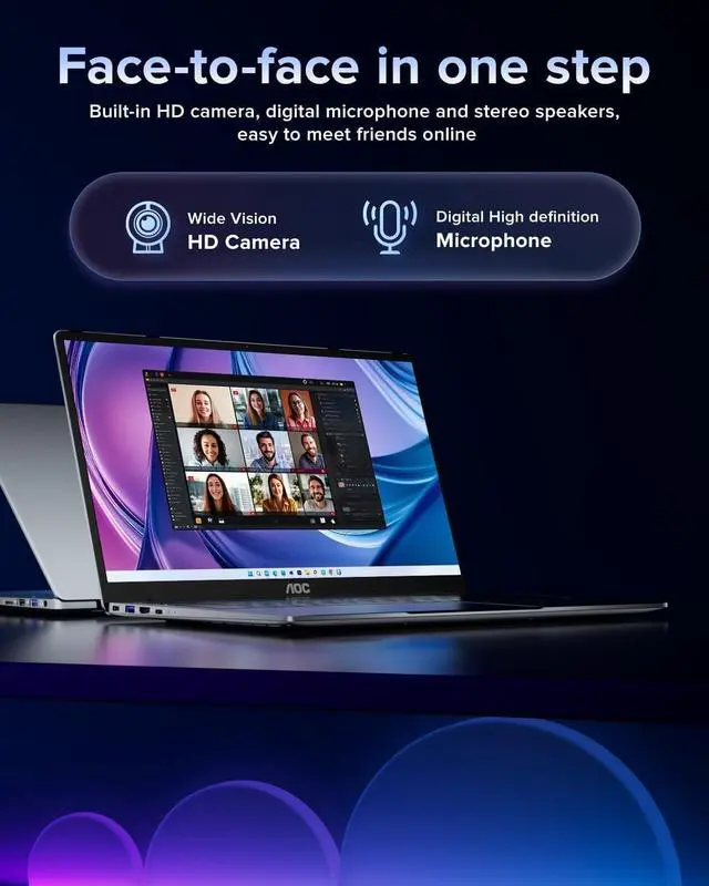 Built-in front webcam above the screen frame video calls at any time. ^^ AOC WORRY CUSTOMER SERVICEThis metal-clad portable laptops weighs just 3.7 pounds and measures 0.72 inches thick will easily slip into backpack, With 5, 000 mAh lithium-ion battery, Enjoy hours of uninterrupted usage, whether you're working, study, gaming, or on the go. 180 hinge makes it easy to share. AOC laptops undergo a 7*24H machine test before shipment to ensure that each rack can function perfectly. Enjoy worry usage with a 1-year and round-the-clock customer service.