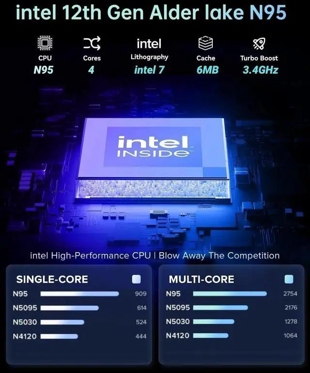 HIGH PERFORMANCE LAPTOPThis AOC laptop powered by N95 processor frequency up to 3.4GH z turbo frequency. (performance is much higher than Celeron N5095/Pentium N5030/N100/N95) Built-in 16GB DDR4 and 512GB SSD and an integrated core graphics GPU, laptop Pre installed with Windows 11 system, its fast and reliable performance, can easily handle documents, web browsing and more powerful multitasking and other tasks, work and play at the same time! ^^ 16GB DDR4 & 512GB SSD EFFORTLESS MULTITASKINGThis AOC laptop computer With 16GB of RAM and 512GB M. 2 2280 SSD. AOC laptops that allows you effortless handle multiple tasks simultaneously without any lag.