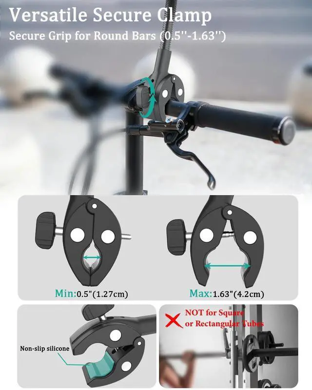 (Note: Not compatible with square or rectangular frames). ^^ [Anti-Shake Metal Gooseneck] Built with reinforced 8mm aluminum alloy, this 8.27" gooseneck arm resists flex, bounce, and sag. Your tablet stays locked at eye level during HIIT, running, or Peloton sessions no shaking, no distractions. ^^ [360 Multi-Angle Adjustment] The ipad holder for treadmill ball joint design allows quick rotation between portrait and landscape, while the locking knob keeps your tablet firmly in position even during intense workouts. ^^ [Extra-Deep Clamp] This Indoor bike tablet holder fits phones and tablets from 6.115. 6 inches, One mount for all your screens! It fits phones and tablets from 6.1" to 15.6", including the 2024 iPad Pro 13", iPad Air 6/5, Galaxy Tab S, and even Portable Monitors. Transform your exercise routine into an immersive cinematic experience with the largest screens on the market. ^^ [Built for Stability & Support] Designed to be intentionally firm for maximum stability bending the gooseneck may require both hands. Includes all mounting hardware and user manual. Backed by a 12-month free replacement warranty. ^^ Supports up to 2.2 lbs (1 kg).