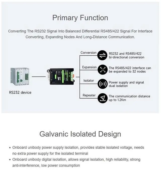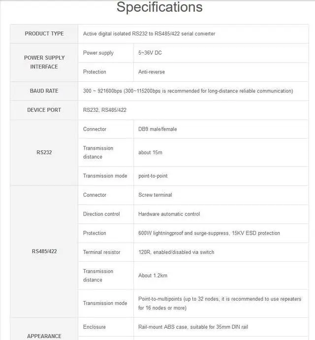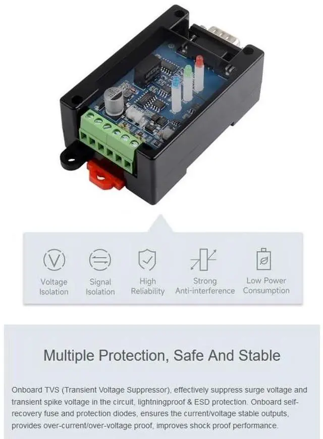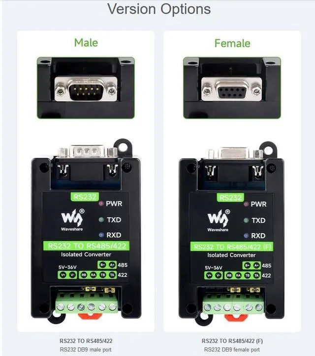 IntroductionRS232 TO RS485/422 (RS232 DB9 Female Port), an industrial grade RS232 to RS485/422 isolated converter, boasts industrial grade rail-mount case design and protection circuits such as the built-in power isolation, ADI magnetical isolation, and TVS diode. It is easy to operate RS232 TO RS485/422 as it features zero-delay automatic transmission conversion, faster communication speed, stability, reliability, and safety, which is applicable for scenarios with high communication requirements. FeaturesOnboard SP3232EEN and SP485EEN chips. Fast communication, stable and reliable, better compatibilityStable transmission at the rate of 300~921600bpsOnboard unibody power supply isolation, provides stable isolated voltage, needs no extra power supply for the isolated terminalOnboard unibody digital isolation, allows signal isolation, high reliability, strong anti-interference, low power consumptionOnboard TVS (Transient Voltage Suppressor), effectively suppress surge voltage and transient spike voltage in the circuit, lightningproof & anti-electrostaticOnboard self-recovery fuse and protection diodes, ensures the current/voltage stable outputs, provides over-current/over-voltage proof, improves shock proof performanceOnboard 15KV ESD isolation protection and 600W lightningproof & anti-surge protectionOnboard 120R terminal resistor on the RS485/RS422 interface, disable by default, configurable by jumperOnboard power supply screw terminal, allows 5V~36V DC wide range input3 LEDs for indicating the power and transceiver statusIndustrial rail-mount ABS case design, small in size, easy to install, and cost-effective.