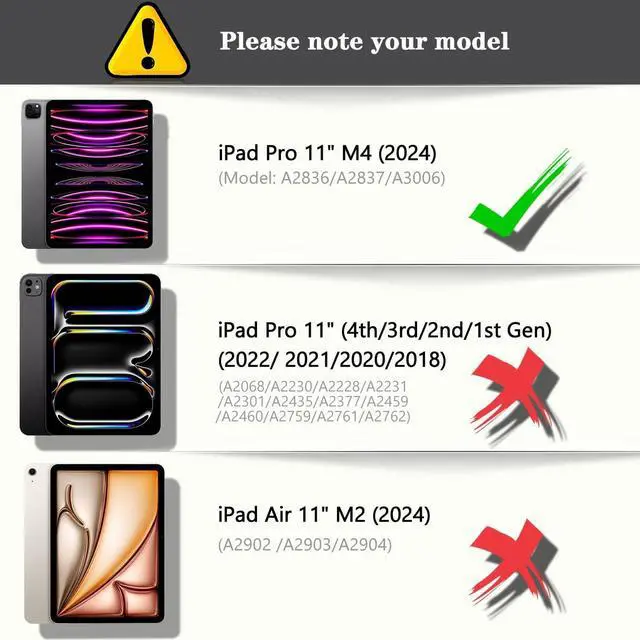 Note: The protective case is compatible with iPad Pro 11 (M4) released in 2024 (Model: A2836/A2837/A3006), and is not compatible with other iPad Pro 11 versions. ^^ The quality thickened TPU back cover not only has excellent shock resistance, but also prevents the machine from being scratched when disassembling the machine. ^^ Built-in sleep magnet, the screen automatically lights up when the lid is opened, and turns off when the lid is closed. ^^ It has a built-in right pen tray, and the pen placed in the pen tray supports magnetic charging and wireless charging of Apple Pencil. ^^ The angle can be adjusted in 3 levels, and the best angle can be adjusted according to different usage scenarios.