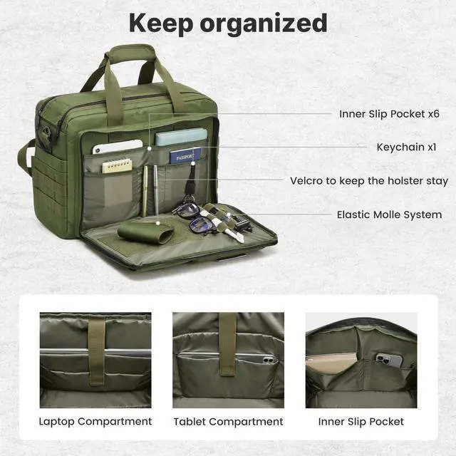 Versatile Use: This laptop bag for men fits airline carry-on requirements (17.7 x 9.6 x 12.6 inches) and features a luggage strap for travel-friendly comfort. With practical design and tactical style, it's ideal for business trips, travel, work, or outdoor use