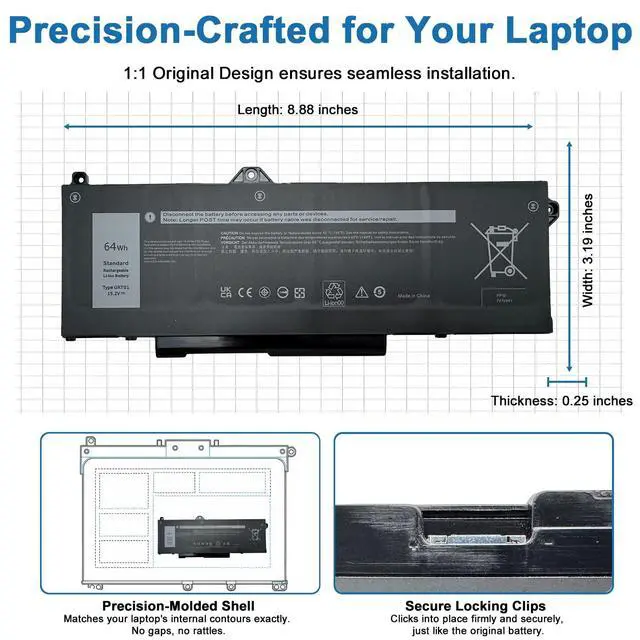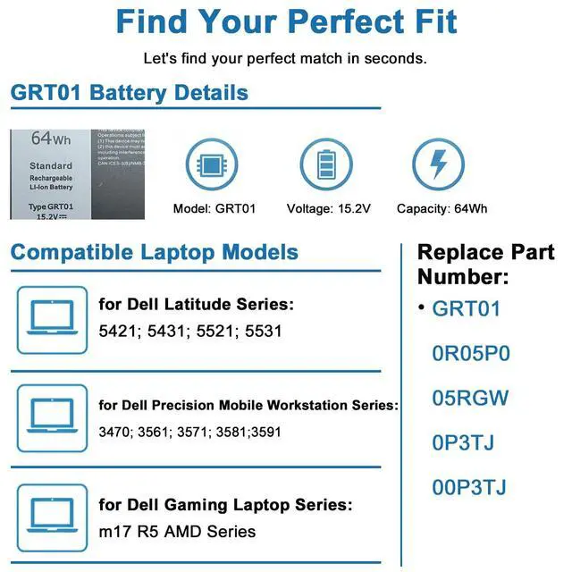 WHAT YOU GET: 1 * GRT01 battery. 1 * User Manual. 4 * Screwdrivers. ^^ Compatible with GRT01 battery. Fit for Dell Latitude 5421 5431 5521 5531 Series; Fit for Dell Precision 3470 3561 3571 3581 3591 Series; Fit for Dell m17 R5 AMD Series ^^ Part Number GRT01 0R05P0 05RGW 0P3TJ 00P3TJ ^^ Outstanding quality All HPXXDJA products have passed CE and UL safety certifications. Each battery has the capacity to provide enduring, continual use. Fully Safeguard your laptop and batteries.