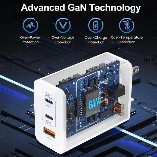 USB Charging Block: -3-in-1 charger plug max total output up to 100 watts. USB-C port supports a max power output of 100W, Provide super fast charging for Macbook/iPhone/iPad. -The compact USB block not only saves charging time for three devices, but also does not occupy socket space. It is also very suitable for home, office, and outdoor travel use. -Fast charger cube built-in safety intelligent chips that can automatically recognize the current required by the device, providing overvoltage, overcurrent, overcharging, and high temperature protection.