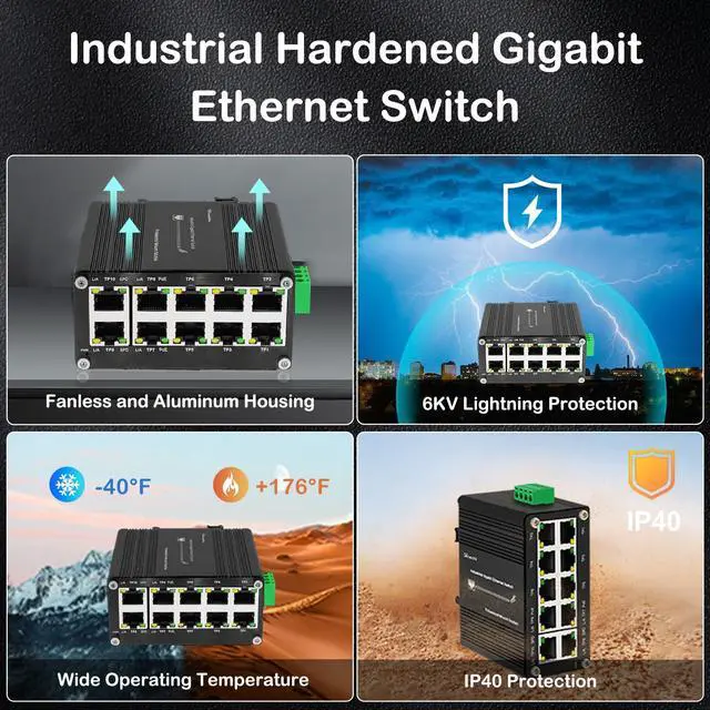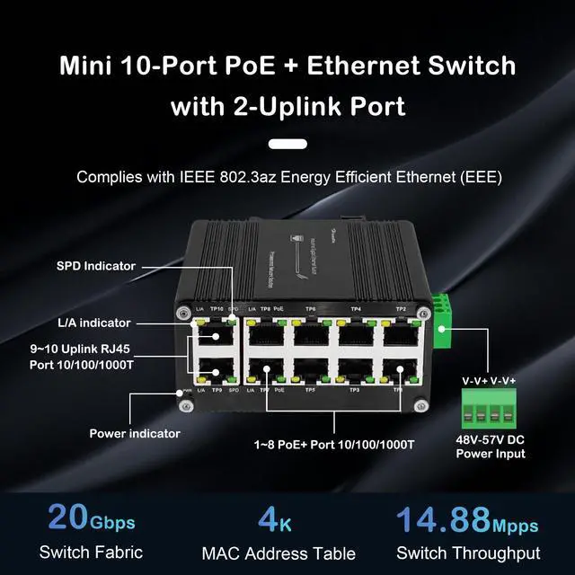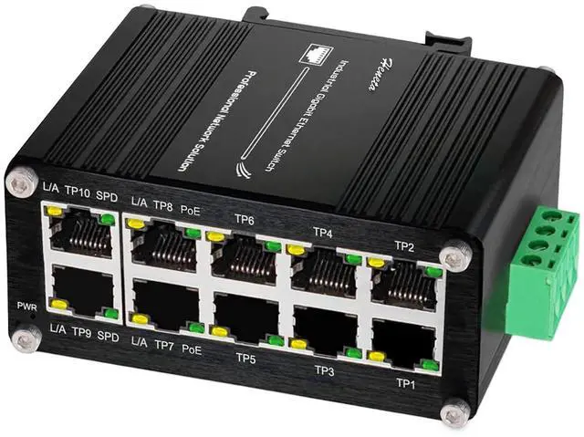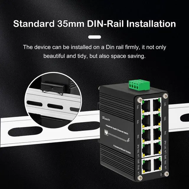 Being able to operate under the temperature range from -40C to 80C (-40F to 176F), PoE+ Switch can be placed in almost any difficult or narrow environment ^^ PoE FunctionsThe Mini Industrial 8 Ports Switch, Compliant with the IEEE 802.3 at Power over Ethernet Plus technology, provides up to 30 watts of PoE output power, giving users the flexibility to deploy standard and high-powered devices simultaneously without software configuration. IEEE 802.3 az Energy Efficient Ethernet (EEE) compliance reduces power consumption and saves energy. ^^ Din-Rail InstallationThe Industrial 10-Port Unmanaged Ethernet Switch supports standard 35mm DIN Rail mounting and can be used in a variety of scenarios such as home and business offices.