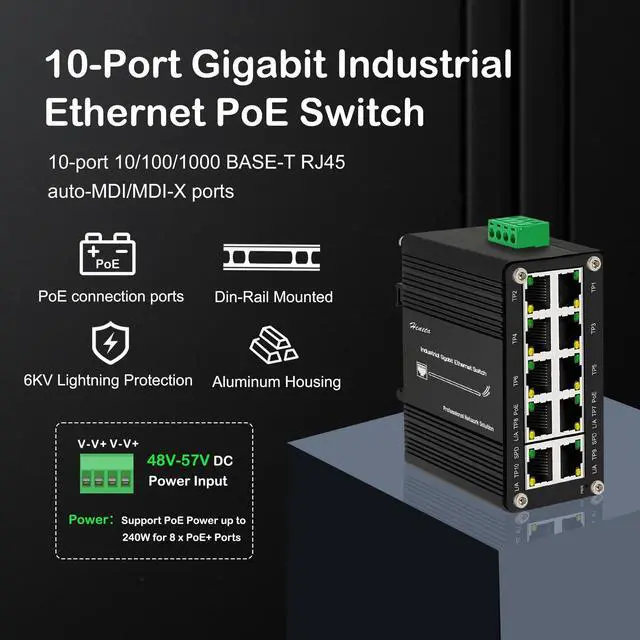 InterfacesGigabit Network Industrial 10 Ports Switch with 8 x 10/100/1000BASE-T ports (IEEE 802.3 at PoE+) and 2 Extra 10/100/1000BASE-T RJ45 copper interface (for uplink connection) supporting 802.3 x Flow control, Full/Half Duplex mode, and Auto MDI/MDI-X functionality. ^^ 48~57V DC & Up to 240W PoE BudgetThe Network Hub 10 Port Din Rail Switch supports 48~57V DC power input for redundant power and operational flexibility with reverse polarity protection. It also offers with a total power budget of up to 240 watts for different types of PoE applications. ^^ Industrial Standard DesignMini Industrial 8 Port Hardened PoE Switch with the IP40 industrial metal case provides a high level of immunity against electromagnetic interference and heavy electrical surges which are usually found on plant floors or in curb-side traffic control cabinets without air conditioning.