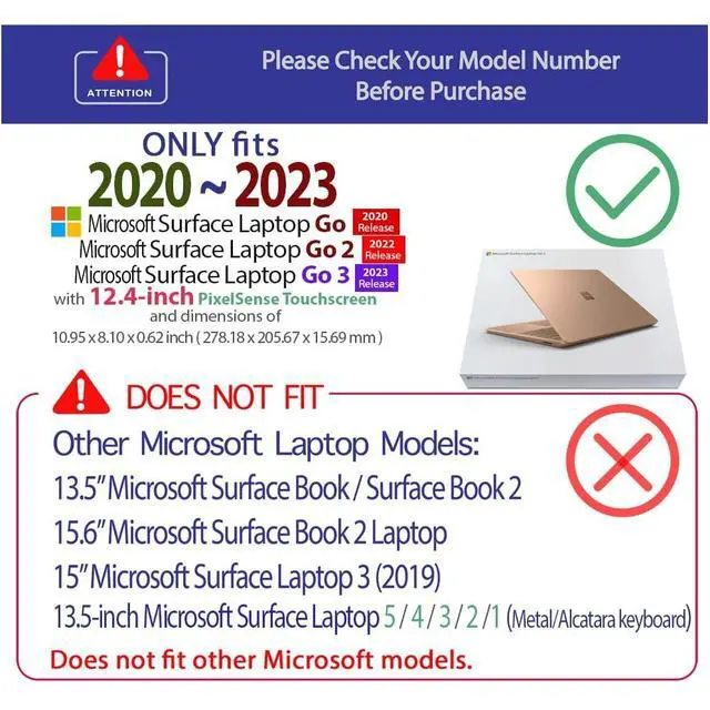 Made of high-quality translucent polycarbonate material, which is shatter-proof and will protect your 2020 ~ 2024 12.4 -inch Microsoft Surface Laptop Go 1 / 2 / 3 all around. ^^ Designed to perfectly fit the 2020~2024 12.4 -inch Microsoft Surface Laptop Go 1 / 2 / 3 and protect ALL corners.