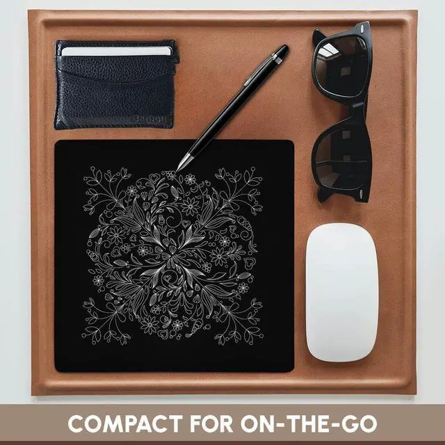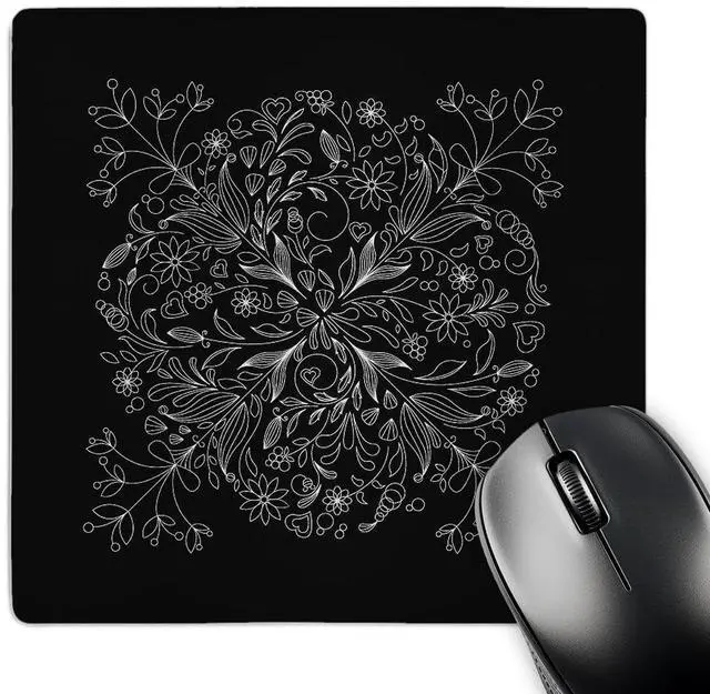 Pretty Lacey Flower Decorated Square In White On A Black Background Mouse Pad is 8" x 8" x. 25" and is made of heavy-duty recycled rubber. Matte finish image will not fade or peel. Machine washable using a mild detergent and air dry.