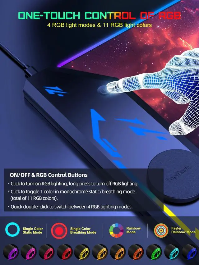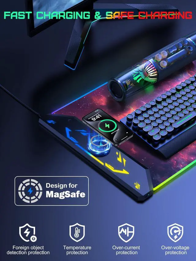 Please Note that both ports are input ports and cannot be used as output ports for power supply ^^ Max 15W Fast Qi Wireless Charging The round raised magnetic charging area has built-in powerful magnets that makes it easy to align the wireless charging position to charge your device, designed for iPhone 17/16/15/14/13/12, AirPods Pro 2nd/Pro/4rd/3rd/2rd (magnetic wireless charging case version only). It also provides up to 15W fast charging for Samsung Galaxy S23/S22/S21/S20/S10/S9/S8/Note 9/8 and other Qi wireless charging-enabled devices. Not compatible with any Apple Watch model ^^ One-Touch Control for 4 Light Modes & 11 RGB Colors This RGB gaming mouse pad has 11 lighting colors and 4 cool lighting modes: Single Color Static, Single Color Breathing, Rainbow, and Faster Rainbow Mode. Long press the RGB light mode option key to control the light on/off (one click also turns on the RGB light); click the option button to toggle between the 11 light colors; and a quick double-click on the option button to toggle between the 4 light modes ^^ Ultra-Smooth Surface This gaming mouse pad is designed with a smooth textile weave to ensure that you have precise control of your mouse with a smooth glide; the comfortable and smooth surface also can also be used as a mouse pad, desk mat, desk blotters and writing pad ^^ Non-Slip Rubber Base The soft and dense non-slip rubber base can keep this desk mat provides excellent grip and keeps the mousepad firmly in place on your desktop, so you can simply immerse yourself in your work or game without worrying about the annoying mouse pad moving around ^^ Durable & Easy to Clean Protects your desktop from scratches, stains, spills, heat and scuffs. The waterproof surface is easy to clean, just wipe with a wet cloth or paper; stitching around the edges of the table pad ensures a more durable and long-lasting pad that won't fray or peel ^^ What You Get Wireless Charging Mouse Pad x 1, 20W USB-C Fast Charger Block x 1, 6.56 ft USB-C to USB-C Woven Cable x 1, User Manual x 1, 24 hour friendly customer service and 12 months of full technical support
