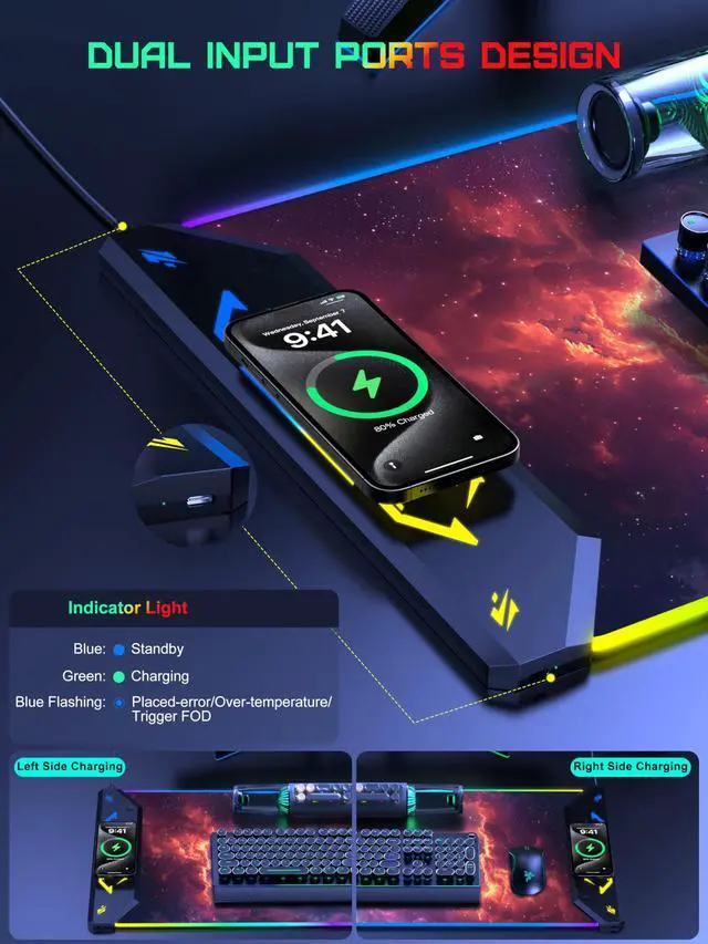 Extra Large XXXL 5-IN-1 Wireless Charging Mouse Pad for Desk TopMade newest extended mousepad is 35.4" x 15.8", the extra large usable area covers your desk keyboard, mouse, and other items while gaming or working, and combines 5 functions of phone charging, AirPods charging, cool RGB light, desktop protector and mouse pad in one, allowing you to charge your iPhone or AirPods while using the gaming mousepad without the need for additional cables interfering with your desk, keeping your desk neat and tidy ^^ Newly Upgraded Dual Input Ports Design This wireless charging desk mat is designed with dual input ports, simply connect the power adapter and charging pad to either input port with the data cable to realize wireless charging, no matter if you are left-handed or right-handed, you can flexibly place the charging pad on the side you need it according to your own usage habits.