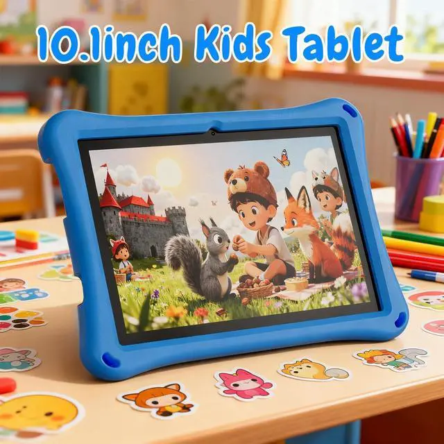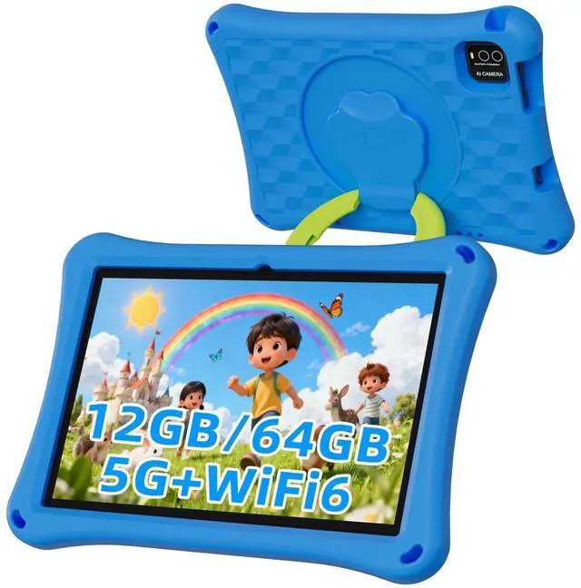Kids Tablet, 10.1 inch Android 13 Tablet, 12GB+64GB, 1TB Expandable, 5G WiFi 6, BT 5.0, Quad-Core, 6000mAh, Dual Camera, AWAWA Parental Control Mode, Blue Light Eye Protection Screen with Case.