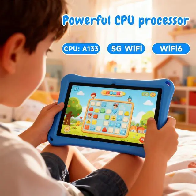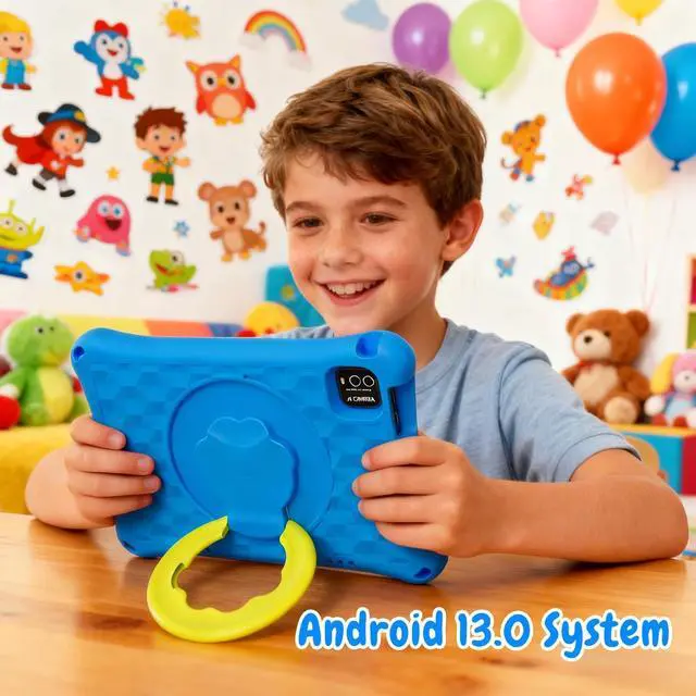 Android 13 Kids Tablet With the latest Android 13, our tablet for kids is safer and faster than others. It can also eliminate unwanted ads when browsing websites. The andriod tablet adopts 2.4 GHz quad-core processor which is 20% faster than normal processors on basic frequency. The kids tablet includes wifi 6, bluetooth 5.0, dual camera, touch screen.