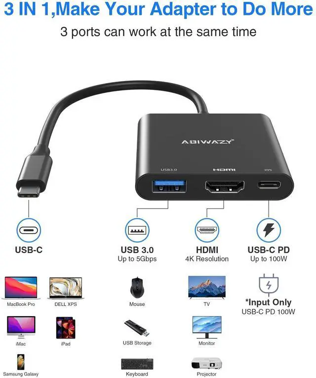 HDMI Adapter 3-in-1: USB C to HDMI Multiport adapter expand laptop USB type-C port to a HDMI 4K@30Hz output port, a PD charging port (No Video Output Support), and a USB-A 3.0 port. Support mirroring of what is displayed on your iPhone or iPad screen to TV, projector, monitor. Perfect for home-theater-entertainment, office, traveling and etc. All ports can be used simultaneously. ABIWAZY provide a 12-month service and 24 hours friendly customer service. If you have any questions, please let us know your concerns ^^