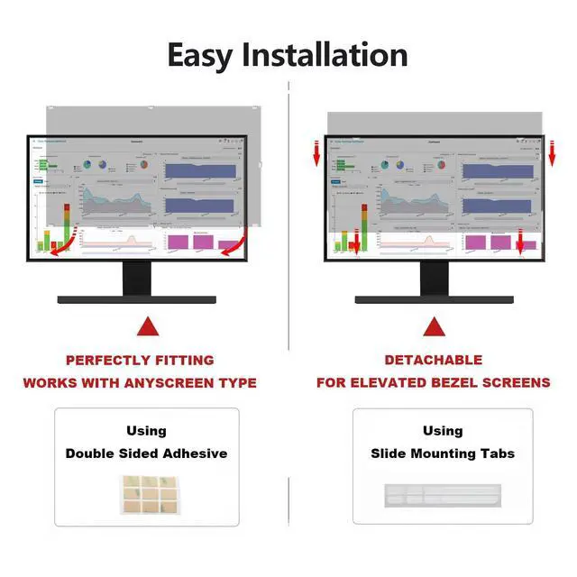 Inch Desktop Monitor- Width: 20 9/16" (522 mm), Height: 11 9/16" (294 mm), Diagonal: 23.6" ( 599.44 mm) - Compatible with HP, Dell, Samsung, Lenovo, LG, Acer, ASUS, ViewSonic, and other monitor brands. Please verify your computer screen's width and height measurements before ordering. It's not recommended to make your selection based solely on your computer screen's diagonal size. ^^ Easy to Install & Two Attachment Options- Simple installation, no bubbles, unlike traditional methods. Option Permanent installation method-double-sided tape sticking. uses clear adhesive strips that securely attach to any screen. Option uses slide mount tabs that easily stick to the display frame, allowing you to slide the filter on and off the screen as needed. ^^ Superior Privacy and Reduce Glare- Our advanced multi-layered film filter blacks out your screen when viewing from the side, while maintaining a crystal clear screen straight-on. This privacy screen protector is reversible (matte/glossy): Gloss surface enhances privacy, matte surface reduces reflections. ^^ Eyes Protection & Anti GlareUpgraded High-quality filter layer that can reduce blue light and UV light. Matte surface, anti-glare, intercepts part of the reflected light. Anti-scratch layer to avoid scratches from daily use. Protect your screen while protecting your eyesight. ^^ Quality ServiceYou can use it in any place where you need to protect the privacy of your screen, including offices, coffee shops, airports, airplanes, trains... Available anytime, anywhere. Pozlle provide no-hassle refund for any reason, Replacement with free replacement if cracks, defects etc. If you have any questions, please feel free to contact us.