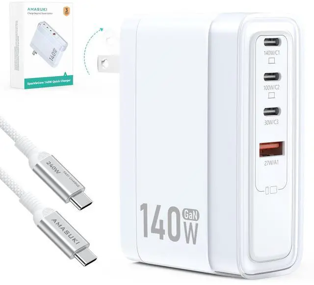What You Get: Amasuki SparkleCore Charger (140W, 4-Port, PD 3.1 ), 6.6 ft 240W USB-C to USB-C cable (Not Compatible with 2025 MacBook Pro 16), 2 pattern stickers, user manual, 36-month warranty, and our friendly customer service