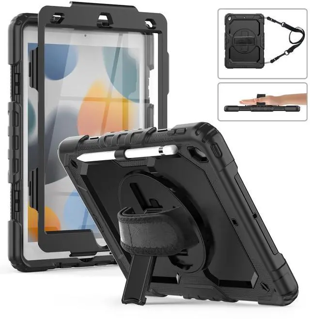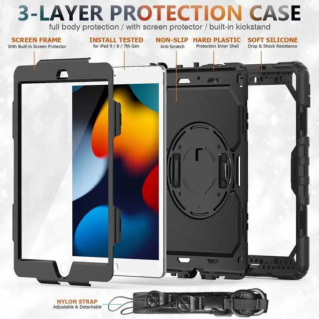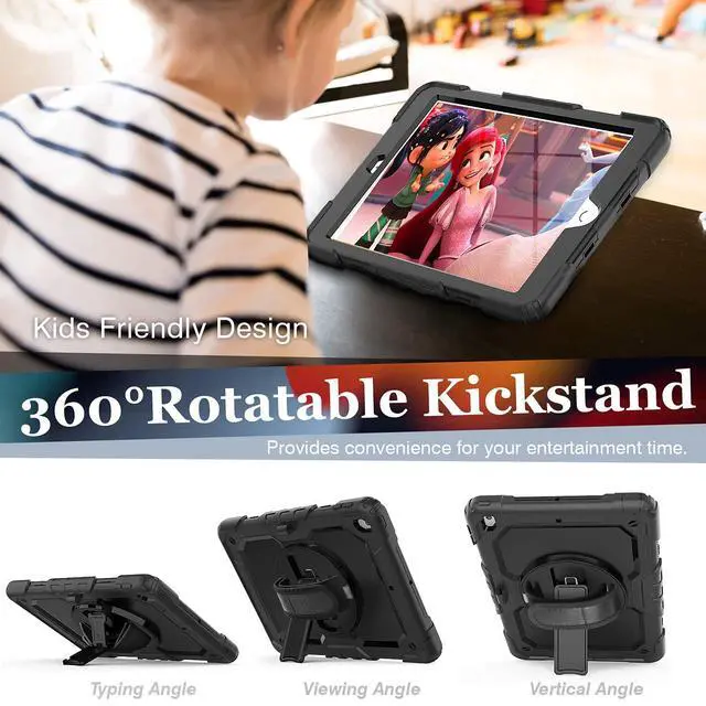 TSQ Case for iPad 9th/8th/7th Generation with Screen Protector for Kids ^^ Military Grade 360 Rotating Stand & Hand Shoulder Strap ^^ Heavy Duty Rugged Silicone Case for iPad 10.2 Inch-Obsidian