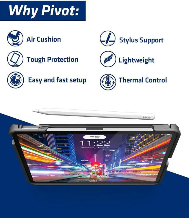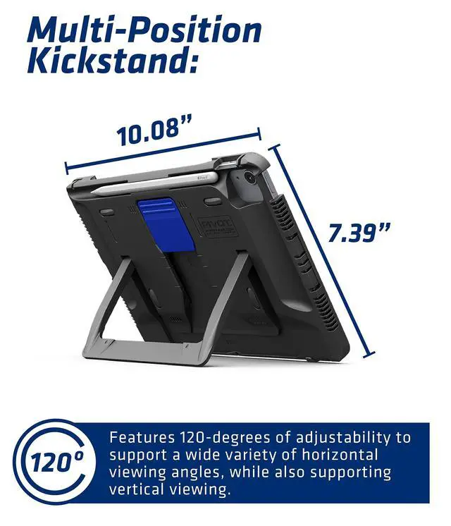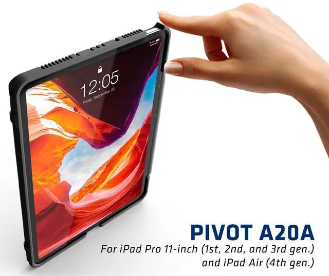 The PIVOT A20A is an elegant, robust case designed specifically to accommodate the key features of iPad Air (4th gen. ) iPad Air (5th gen), and iPad Pro 11-inch (3rd gen) while maintaining full compatibility with the iPad Pro 11-inch 1st and 2nd gen. With numerous enhancements, this is the best PIVOT case yet. It offers unbeatable 360-degree protection from drops, impacts, and scratches, while the detachable PIVOT Screen Cover provides superior screen protection in transit and while connected to any PIVOT mount. The improved 2nd generation PIVOT Kickstand is reinforced with internal ribs for maximum strength and durability and provides 120-degrees of adjustability to support a wide range of viewing angles.