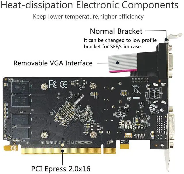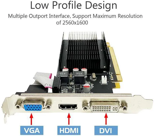 2GB GDDR3 MemoryAMD Radeon HD 5450 graphics card is with 650MHz core frequency, up to 1066MHz memory speed, 80 Stream Processors, perfect for working, video and photo editing, allows good fluency, which can effectively meet your needs. ^^ Low Profile DesignThe computer graphics cards is small in size, saves more space and plug and play. Small Form Factor design fits in todays low profile desktops and workstations (with half height bracket). ^^ Multi-monitor SupportSupports up to two monitors for the video card including DVI, VGA, HDMI, and for flexibility of use (the VGA Interface is removable), This low profile, low power consumption card will improve multimedia performance, extend the desktop, and accelerate apps.