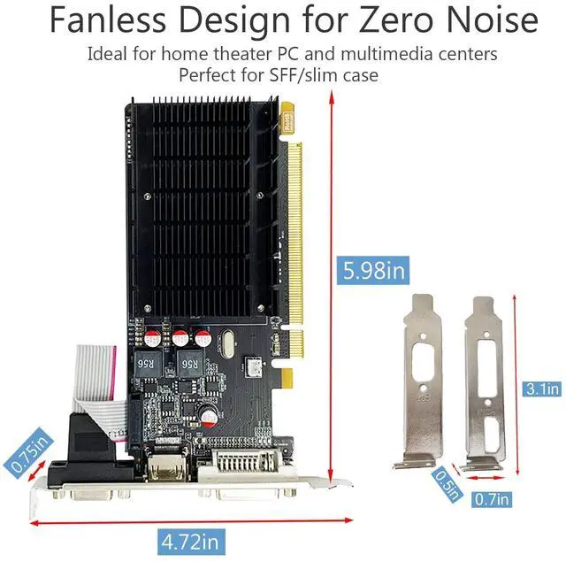 ^^ Fanless Design for Zero NoiseThe HD 5450 is a budget video card with silent passive fanless cooling system. Using high performance heatsinks, it is small enough to provide fanless operation and comfortable to use with zero noise. ^^ Independently PowerNo external power supply, about 19W full-load power consumption. Works with Windows 10 as well as 7, 8 and 8.1 (NOT compatible with windows 11).