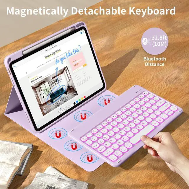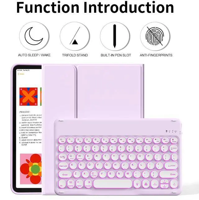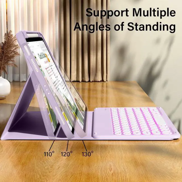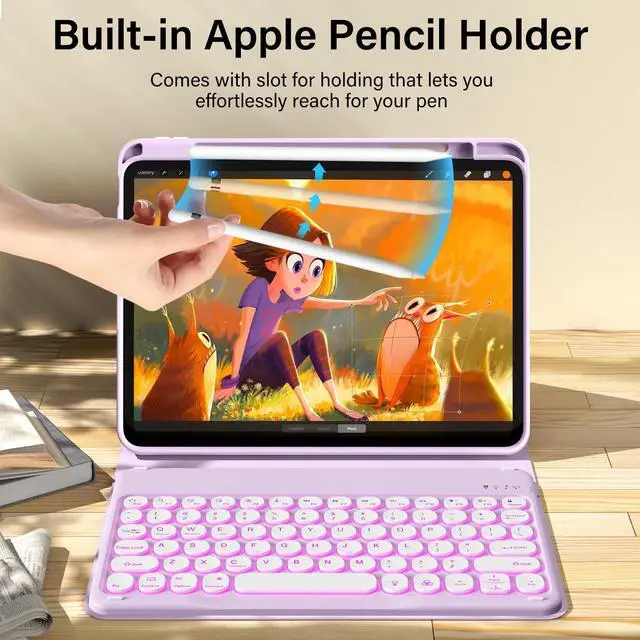The protective shell can be placed at different tilt angles to adjust the optimal viewing angle, very flexible and user-friendly. ^^ Buit-in Pencil Slot & Sturdy PU MaterialThe ipad 11/10th generation keyboard case has a convenient right side built-in pencil slot that easy to storage and remove your pencil (Apple Pencil is Not included). Premium PU leather cover is waterproof, scratch proof and fingerprint proof, providing full protection for your beloved tablet. ^^ Practical 7-Color Backlight KeyboardThis keyboard has 7 LED backlight colors and 3 brightness options. The colored circular keycaps are very cute and personalized.