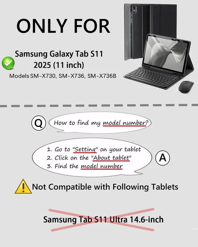 Model CompatibilityKeyboard Case Designed ONLY for Samsung Galaxy Tab S11-11inch, Models: (SM-X730, SM-X736, SM-X736B) Before you order, please check the back of your iPad to confirm the model number. ^^ Magnetically Detachable Keyboardcase for Samsung Galaxy Tab S11-11 inch comes with a detachable magnetic keyboard. The ultra-thin and lightweight magnetic keyboard can be firmly attached to the case, which helps the tablet stand upright and turn it into a mini laptop in less than a second. You can move and change the keyboard position at any time according to your usual preferences. ^^ Adjustable Viewing Angles and Support for Pencase supports 3 viewing angles and has anti-slip slots. Move the tablet forward or backward along the case to choose a suitable angle to use the tablet for writing, viewing, reading, drawing, etc. Built-in Pen holder makes it easy to carry the Pen with your device. ^^ Bluetooth Rechargeable MouseThis colorful wireless mouse supports bluetooth connection, the keyboard and mouse can be connected to your tablet at the same time. the mouse can be recharged by type-c, which allows you to use the mouse easily. ^^ Premium Protectionkeyboard case for Samsung Galaxy Tab S11-11 inch has full edge coverage and provides full 360 protection against scratches, bumps or dents, protecting your tablet from all kinds of dropping accidents.