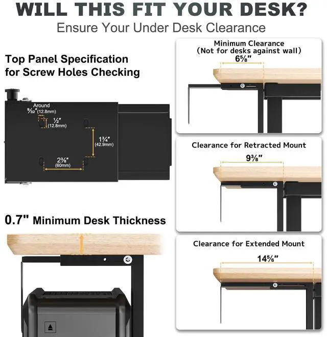 Mounting Solution: Designed to hold your PC case securely beneath your desk, freeing up workspace and reducing dust exposure. Ideal for standing desks or workstations with at least 0.7 desktop thickness ^^ Adjustable Fit for