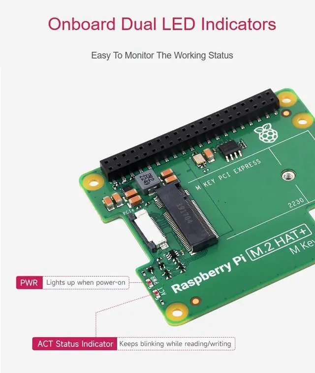 Overview1. Official Pi PCIe To M. 2 HAT for Raspberry Pi 5, HAT + Standard, High-Speed Reading/Writing, Supports NVMe Protocol M. 2 Solid State Drive2. Compatible With 2230/2242 Size M. 2 Solid State Drive. Supports Gen2 and Gen3 Modes, Supports Booting PI5 From Solid State Drive3. Onboard Dual LED Indicators. Easy to monitor the Working Status4. Onboard EEPROMPackage ContentPi M. 2 HAT+ x1