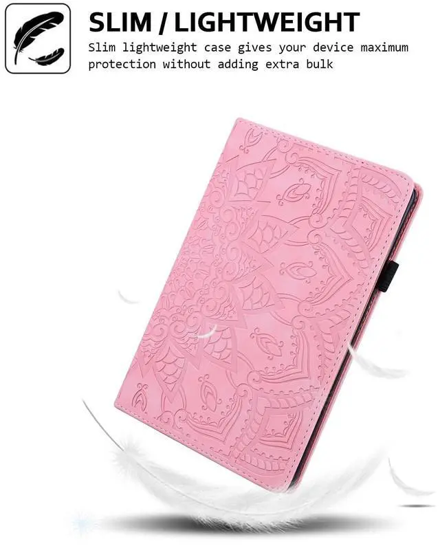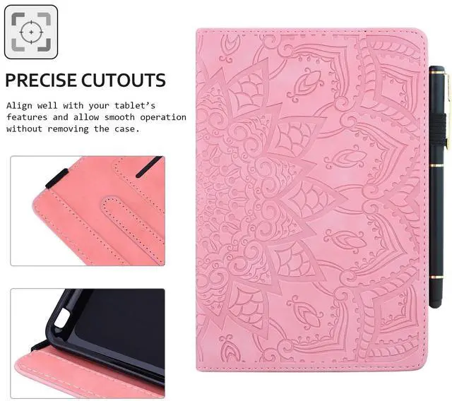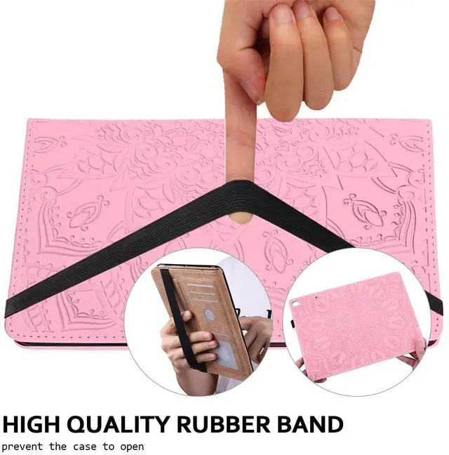 Features: Pretty mandala flower embossed surface, offers exquisite and attractive look for your tablet. Easy access to all features and controls (camera, charging port, volume button, etc) without removing the case. Elastic strap closure ensures cover securely closed, double fixing your device when fold the front cover backward for reading. Front-to-back protective cover case give a full protection for your tablet against dust, water, fingerprints, scratches, shocks and bumps. Interior with 2 card holders for carrying your ID/ credit cards/ business cards/ photos. Side with an elastic loop holder for stylus.